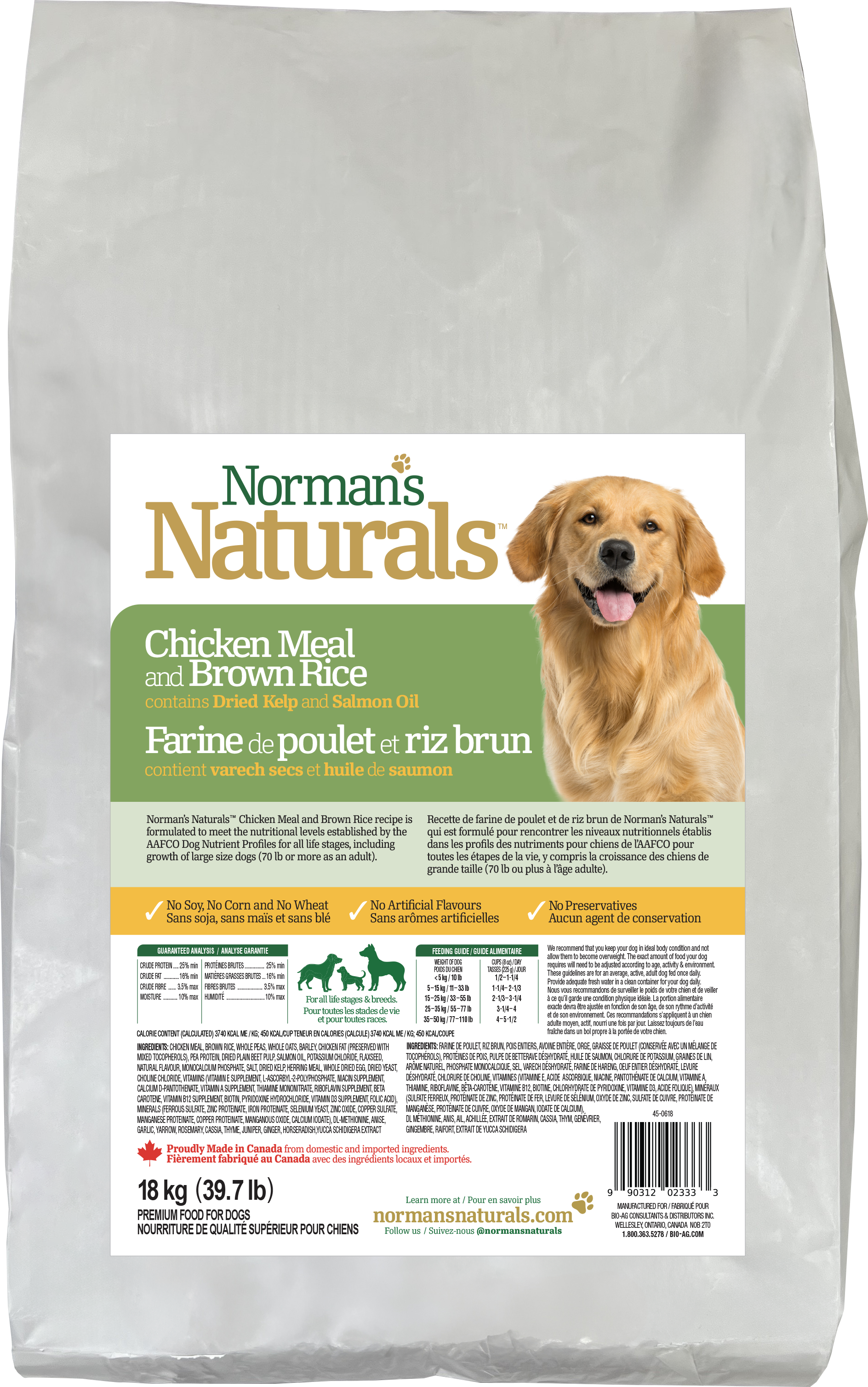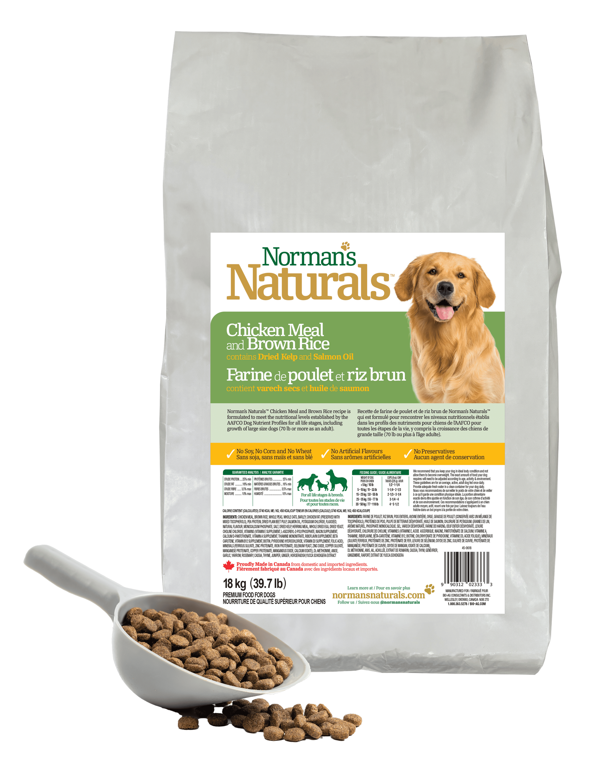 Norman’s Naturals™ Chicken Meal and Brown Rice Recipe is a nutritionally complete dog food for puppies, adults, and seniors—including large breeds. Formulated for all life stages, it contains seaweed meal rich in essential trace minerals, and salmon oil to support skin, coat, digestion, and a strong immune system. Made with high-quality ingredients and free from wheat, soy, and corn!